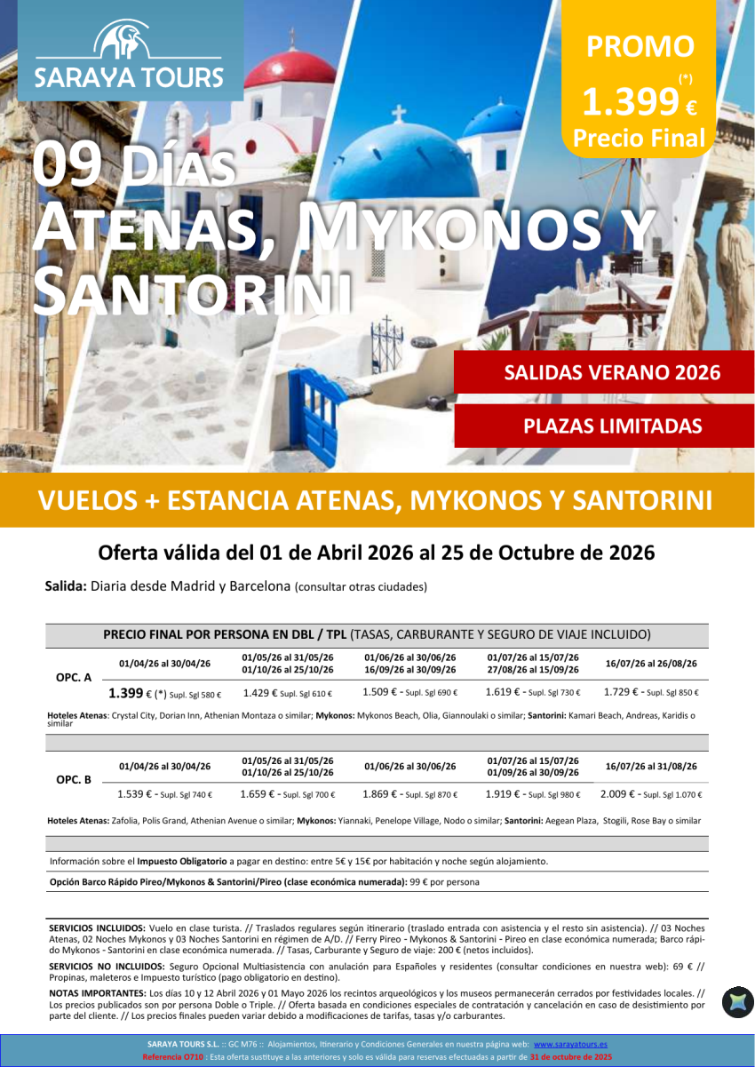 Promo Islas! Atenas, Mykonos y Santorini 09días: Vuelo, Hotel y Traslados Incluidos hasta Oct 26